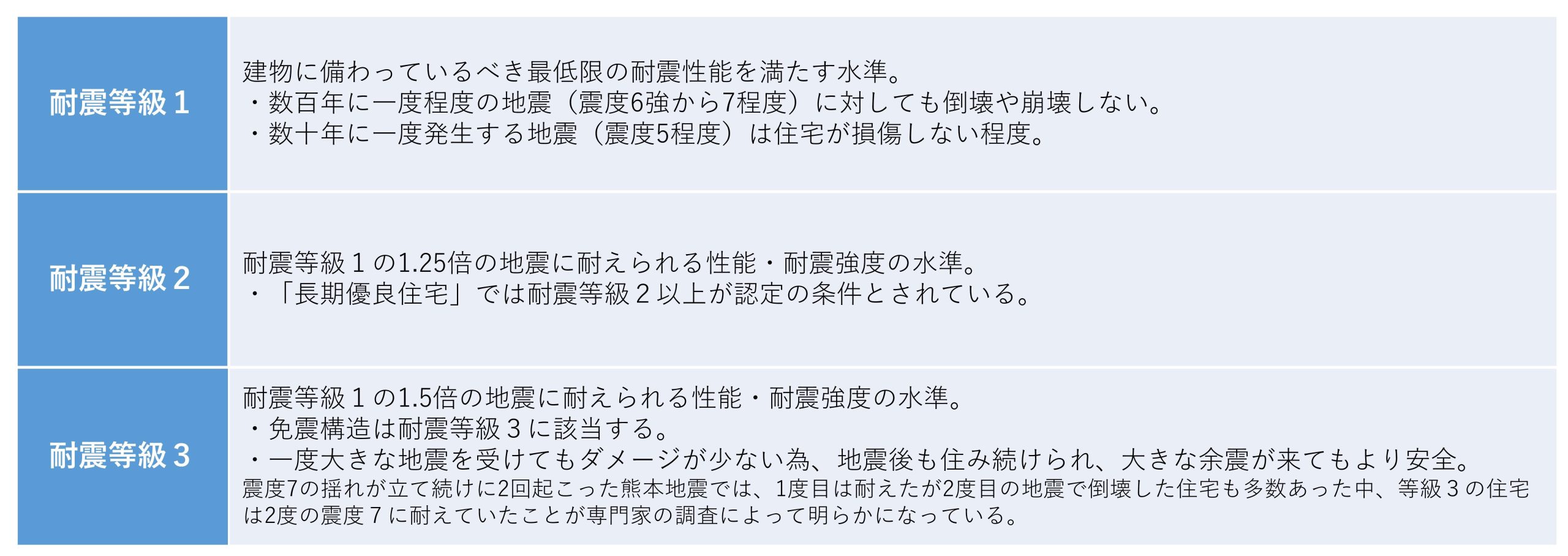 耐震等級は地震に対する建物の強度を等級1から等級3の3段階で評価しり指標で、2000年に施工された「住宅の品質確保の促進等に関する法律(品確法)」に沿って定められています。