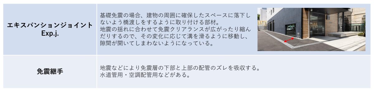 ■免震設備:地盤と建物の間に地震時に非常に大きな変位が生じるため、変位吸収を行う設備が必要になります。