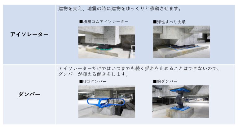 ■免震装置:免震装置はアイソレーター(支承)とダンパーから構成されます。